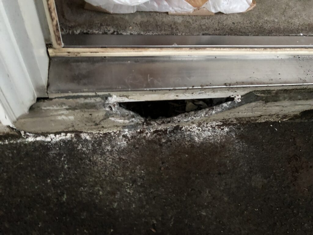 ドアの下のサイディングが欠落して、穴が空いていますね。