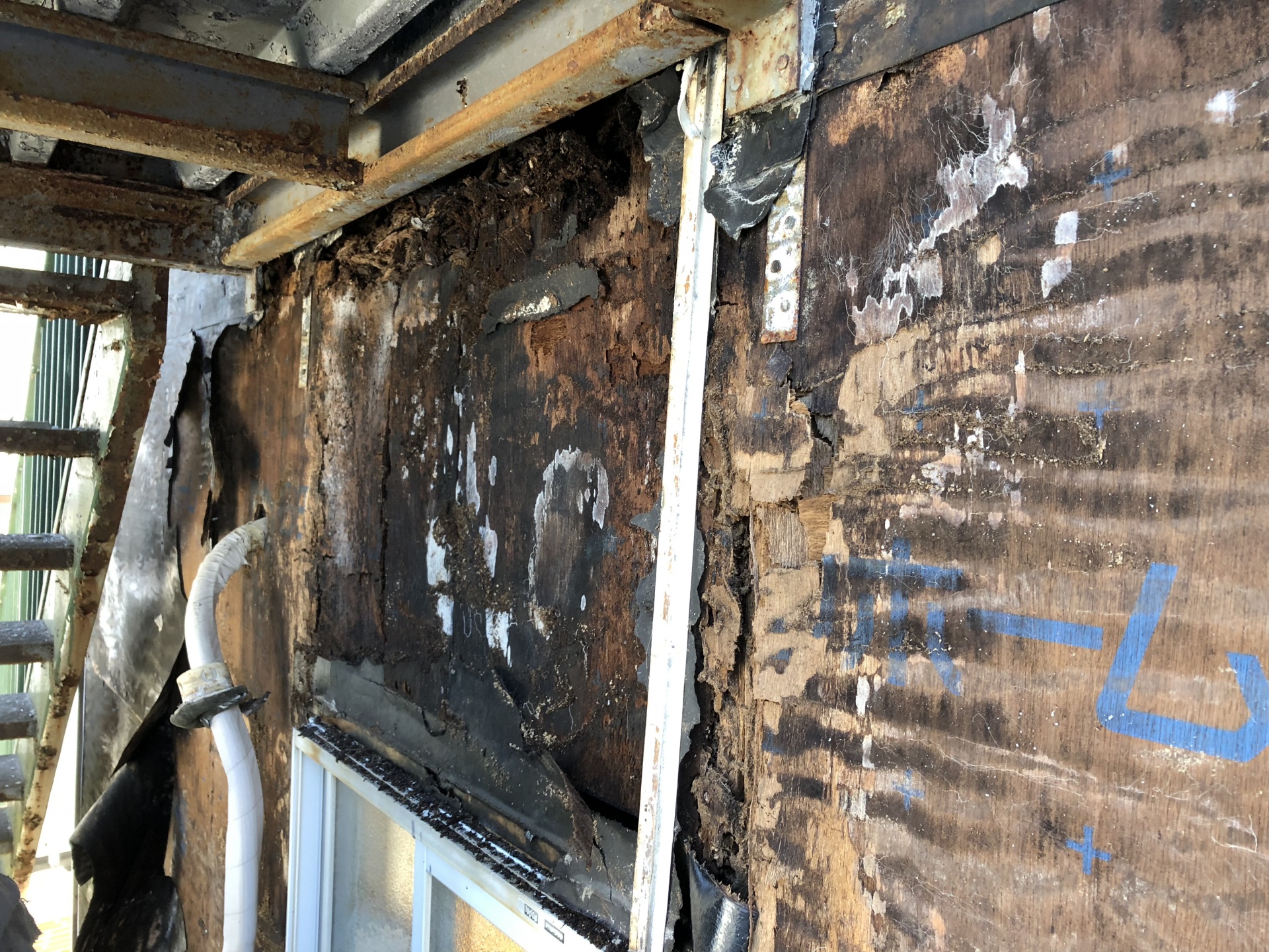 ここから雨水が侵入し、ベニヤや間柱を腐らせてしまっていました。この部分のサイディングは撤去し、水切りを造作して取り付けていくことにしました。