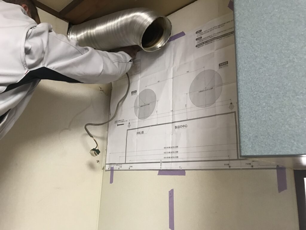最後はビルトインコンロの交換です。写真は既存のコンロを撤去したところです。この状態から清掃をし、新しいコンロを入れていきます。