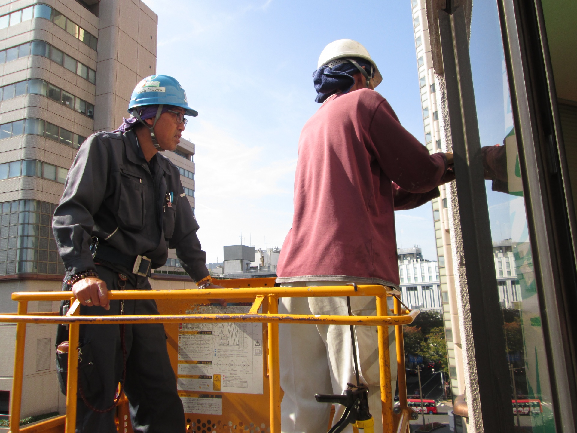8Fにあるボクシングジムの外壁のサッシからの雨漏りがあり、上階から順に7F・5F・4Fと雨漏りがあるので、上から順に作業しながら降りてきます。