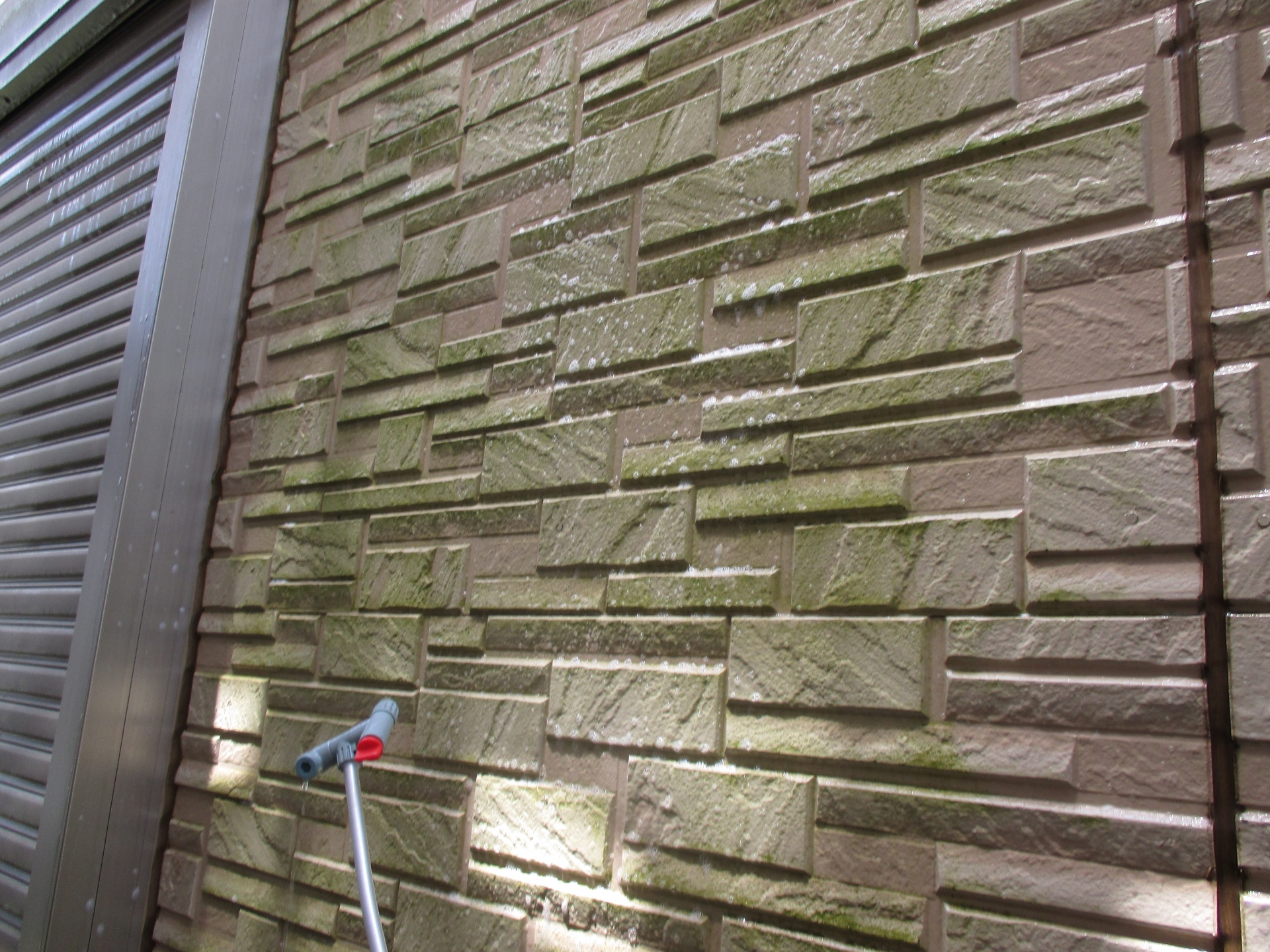 足場を組んだ後に高圧洗浄を行っていきます。クリアー塗装の場合は、外壁の状態が良くなくてはなりません。今回、塗装を行った施主様のお宅は、周りに植栽がある事から苔等の汚れが外壁についていますので洗浄にて完全に除去しないといけません。そこで注意しないといけないのが、年数が10年以上たっている場合に、高圧洗浄では汚れが落ちない可能性が出てきます。ここがポイント⇒汚れがひどい場合は薬剤を使い、汚れを除去します。(商材:スペースショット)