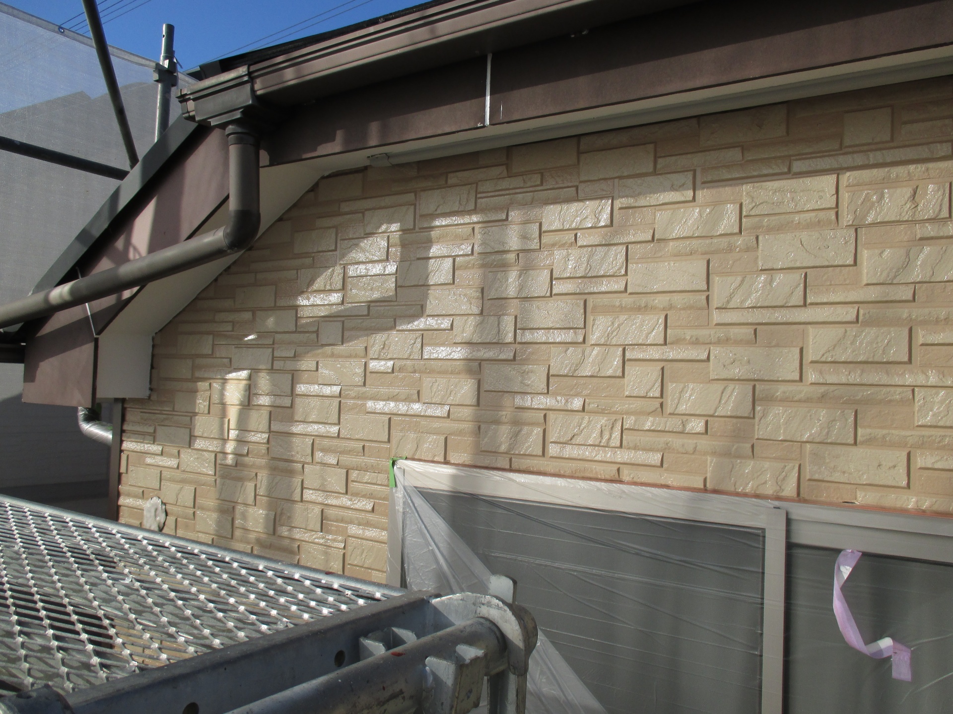 外観としては赤系統を基調とした色彩となり、3~4色のサイディングボードになります。塗りつぶしの場合、凹凸の色が一色になりますので外観としてはモルタル壁と同じような仕上がりに感じます。もちろんその場合でも仕上がりとしては綺麗になりますし、個人差がありますので良いのですが、新築当初のサイディングボードを気に入られている方もいると思いますので、その場合に有効な塗装工事といえます。
