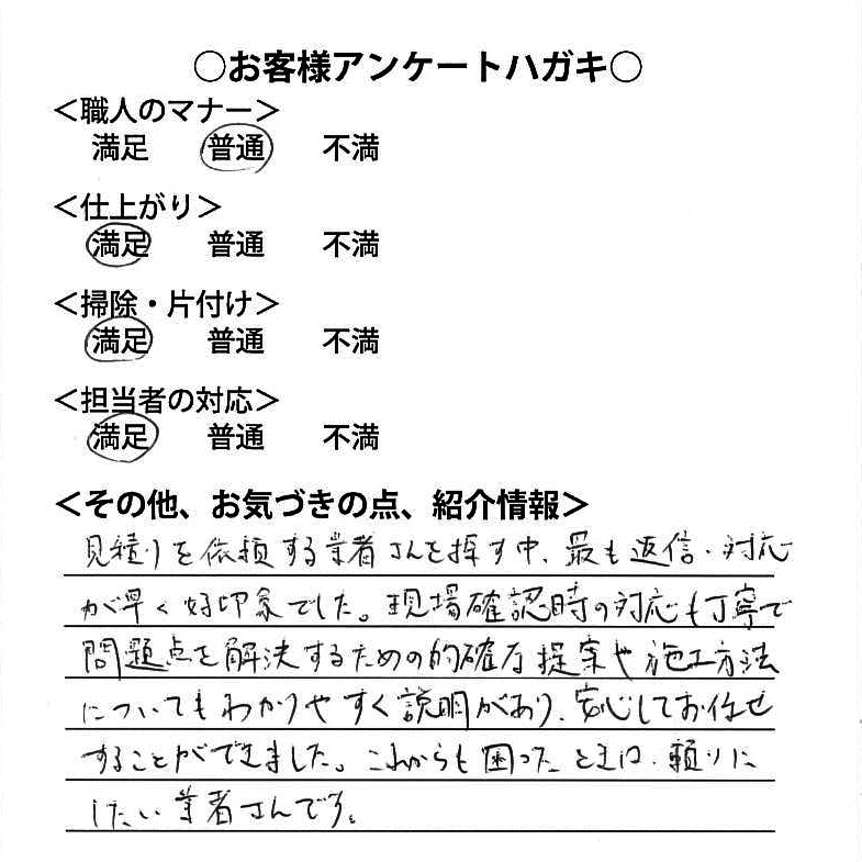 お客様アンケート 見積りを依頼する業者さんを探す中、最も返信・対応が早く好印象でした。 現場確認時の対応も丁寧で問題点を解決するための的確な提案や施工方法についてもわかりやすく説明があり、安心してお任せすることができました。 これからも困ったときは頼りにしたい業者さんです。職人のマナー 仕上り 掃除・片付け 担当者の対応 リフォーム内容詳細施工年月2024年1月ご住所千葉市中央区鶴沢町施工詳細カーポートパネル交換 担当スタッフよりこの度はお問い合わせより工事の依頼いただきありがとうございました。 風が強い日にまた飛ばされないようしっかりと固定させて頂きましたのでご安心下さい。 今後共宜しくお願い致します。担当本社 齋藤 柏市酒井根:屋根カバー工事 千葉市緑区誉田町:外構工事