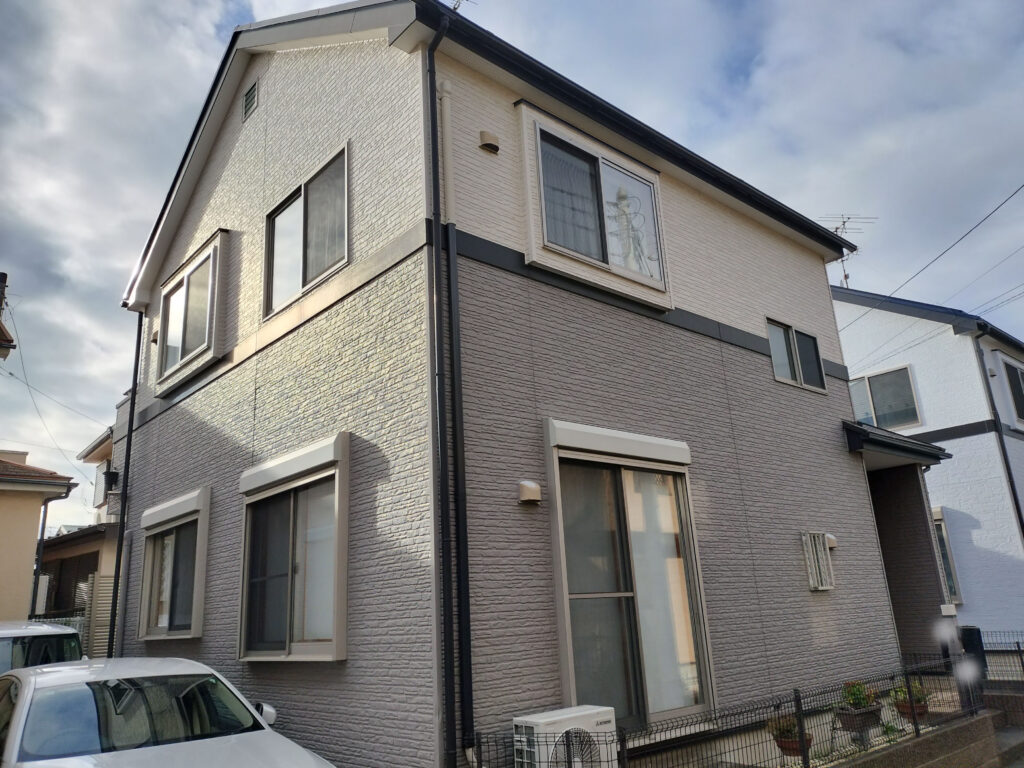 外壁の中間部分に付いていた傷んだ化粧帯を撤去、上下2色塗分けからシックな濃いグレーの単色仕上げとなりました