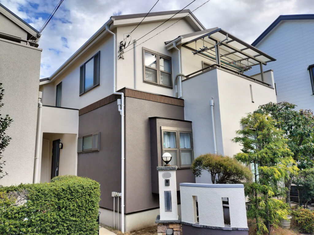 外壁は全体的にひび割れが多かった為、下塗りを2回+主剤2回の計4回塗装で仕上げました
