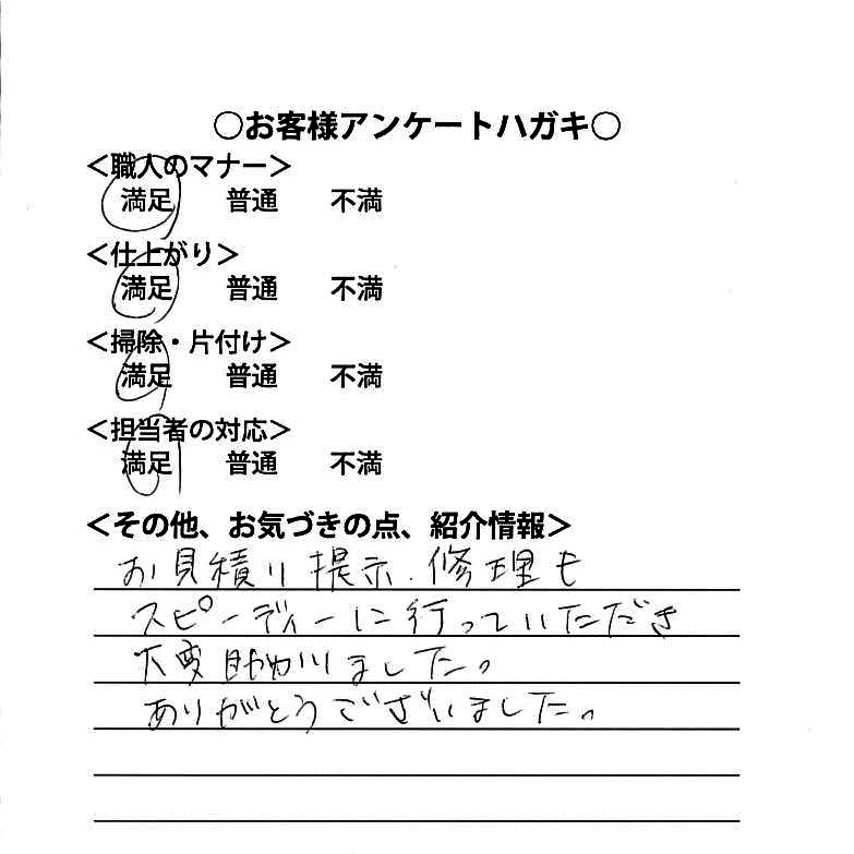 こちらこそありがとうございました。施主様にも周囲の声掛け等行っていただき、スムーズに施工することが出来ました。現在、ご予定の工事は予定されていないと思いますが、何かお困りごとがありましたら弊社を覚えといて頂けたら幸いです。今後共よろしくお願いいたします。