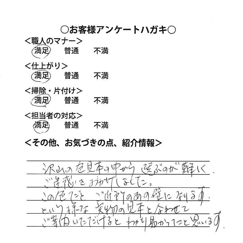 最終的には小さい見本ではなく大きいA4判の塗板を外壁に並べて決めて頂いておりますがその他に良い方法があるのか今後もさらに追及してまいります