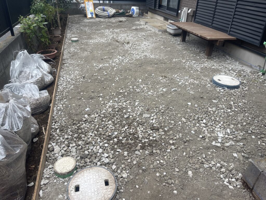 - 下場の雑草等を鋤取りし、砕石を巻いて整地転圧していきます。