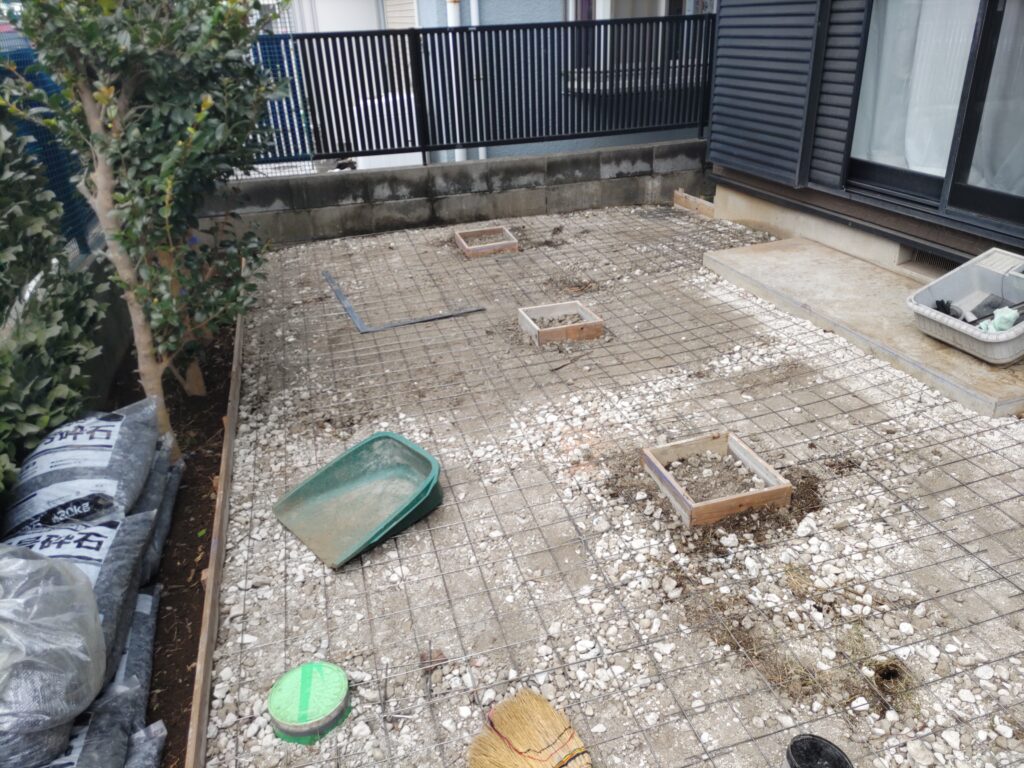 - テラスの足部分を型枠して、周りにメッシュを敷き詰めていきます。