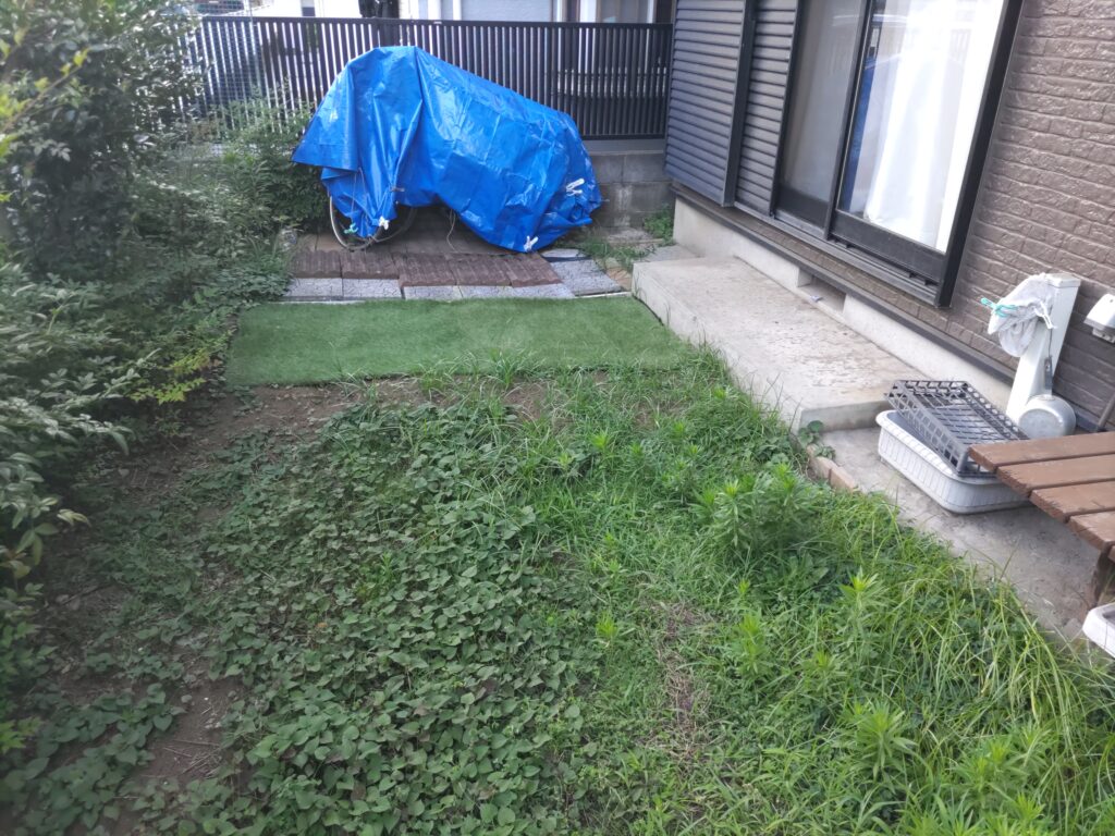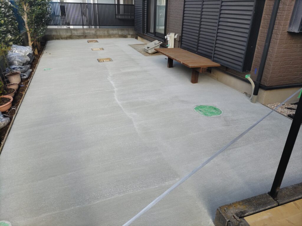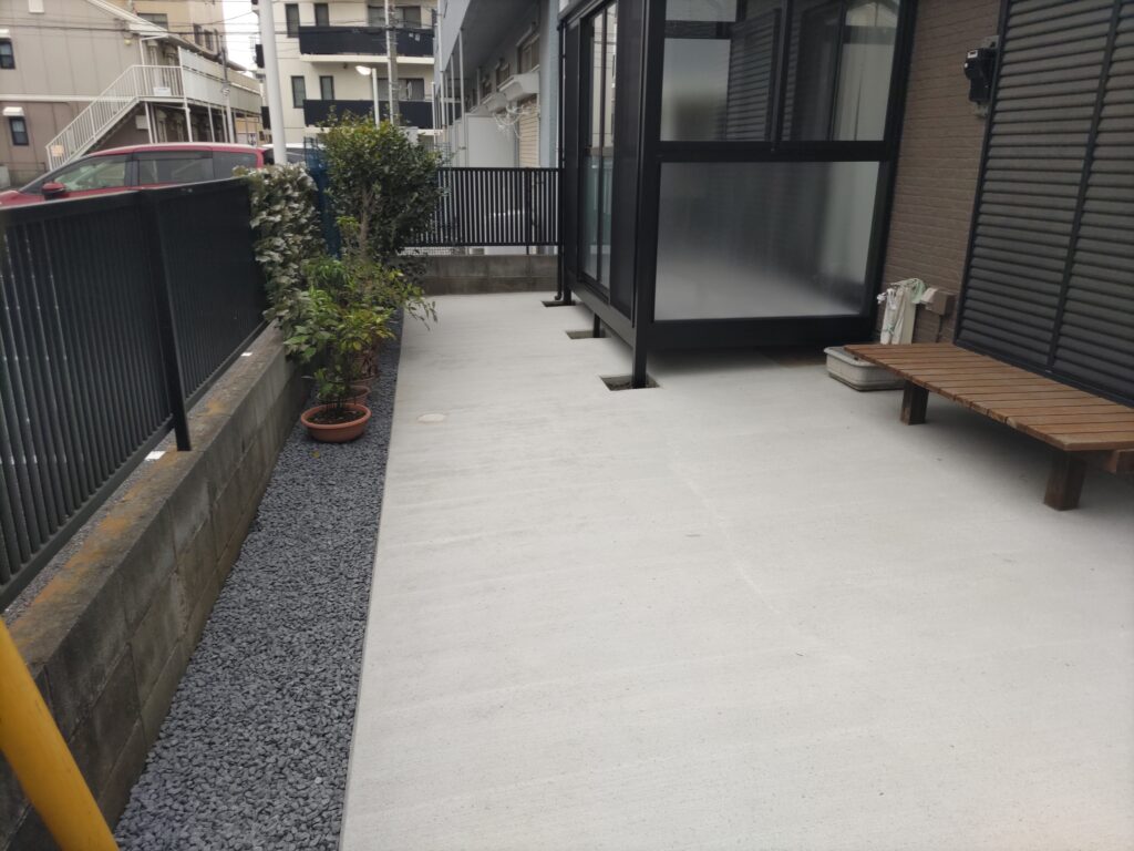 こんにちは。市川支店の井辺です。今回はお庭の外構工事を行いました。雑草などが多く生えてくるのを処理するのが大変との事で、土間コンクリートを打設し、掃出し窓前にはテラスを設置しました。