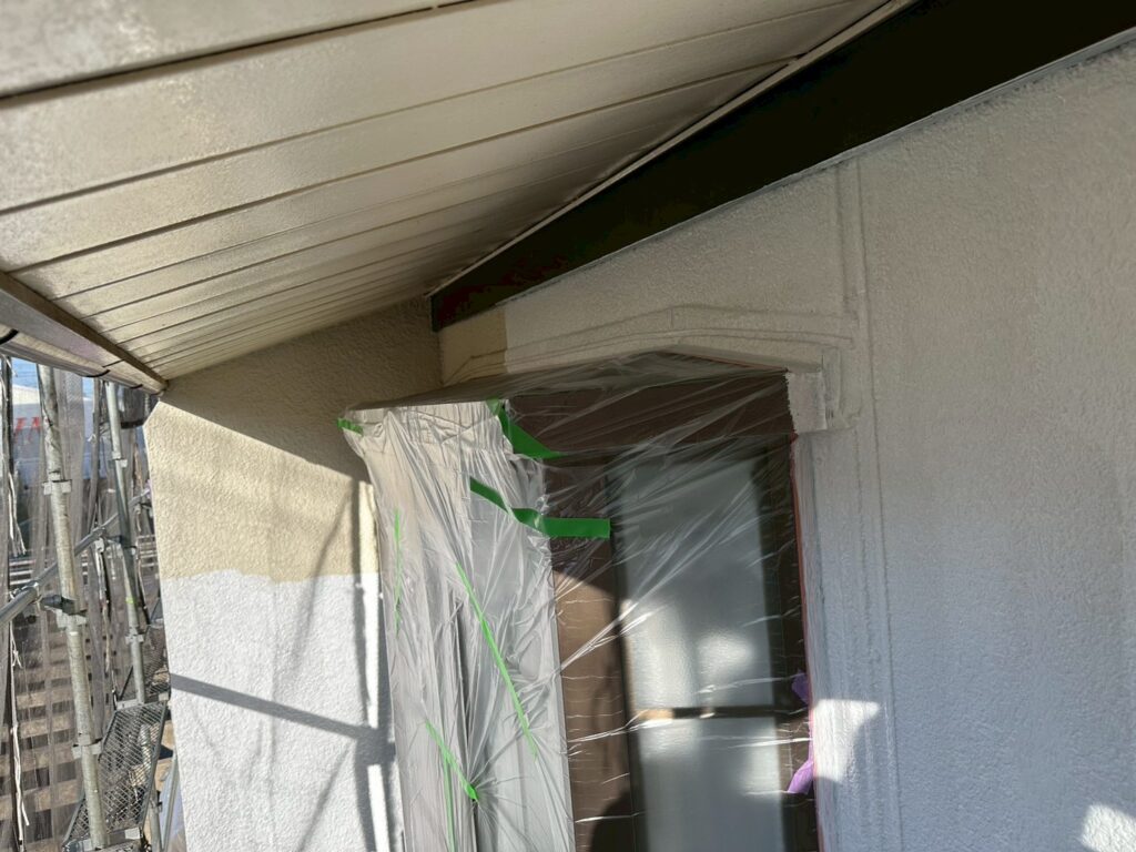 - 屋根下塗り乾燥待ちの際に、外壁の施工に取り掛かります。開口部養生を行っていき、下塗りを行っていきます。