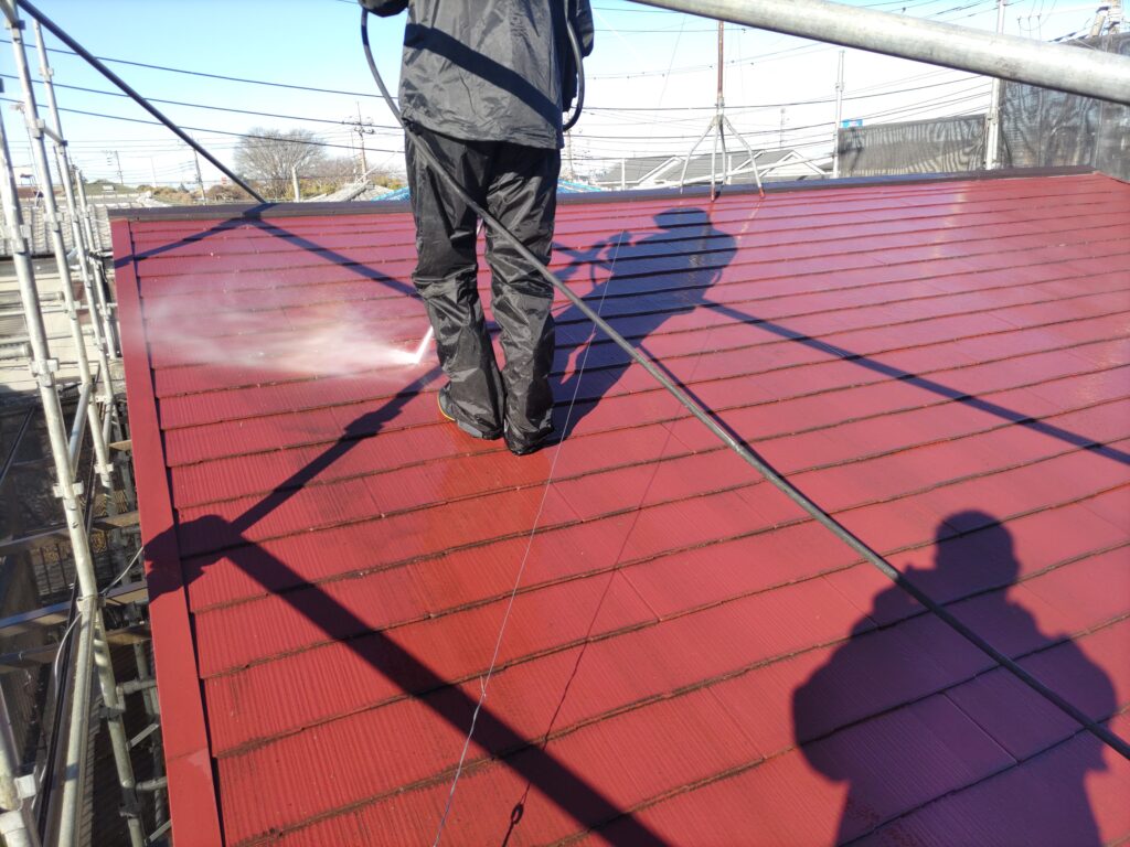 - 棟板金交換後、塗装工事の工程に入っていきます。高圧洗浄を入念に行っていきます。