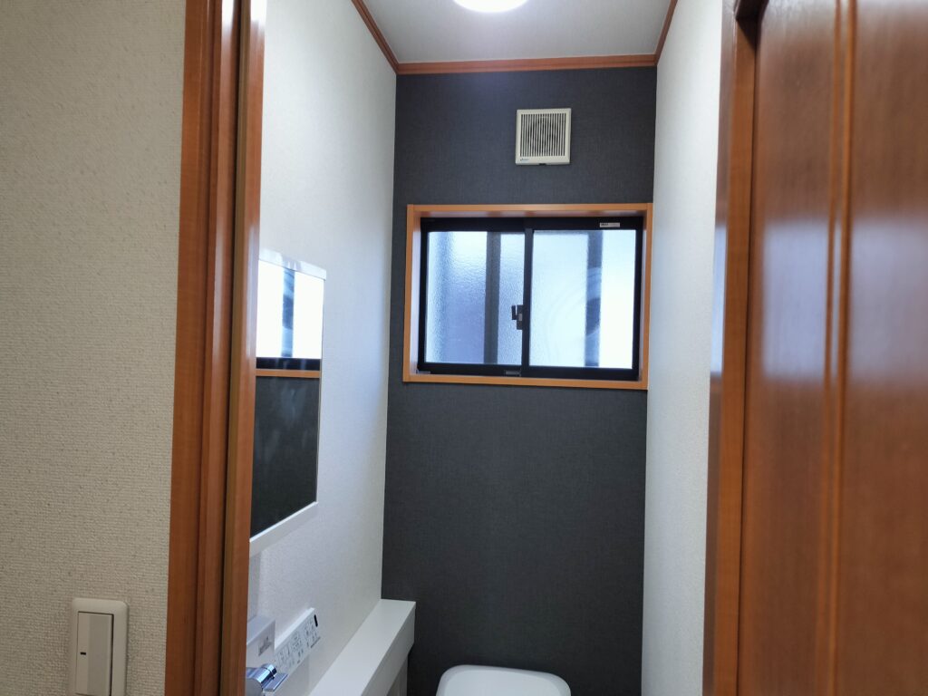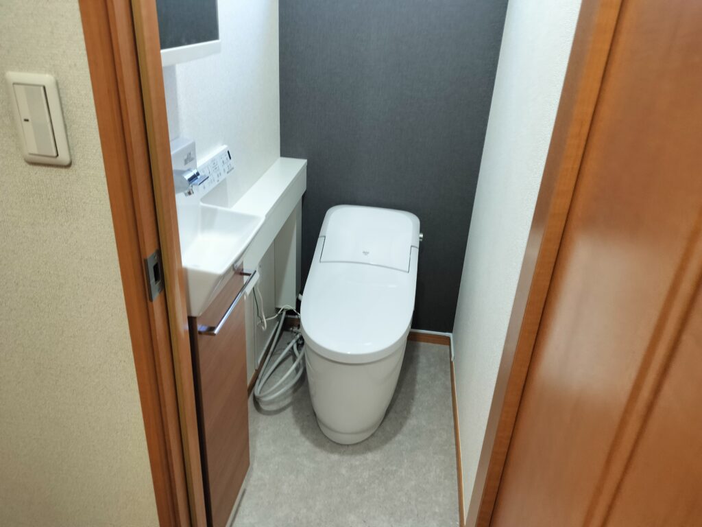 以前からお付き合いのあるお客様からトイレ工事のご依頼がありましたのでご紹介します。一般的なトイレからタンクレストイレ(LIXIL:プレアスLSタイプリトイレ手洗カウンター付き)になります。アクセントカラーが引き立つ仕上がりになりました
