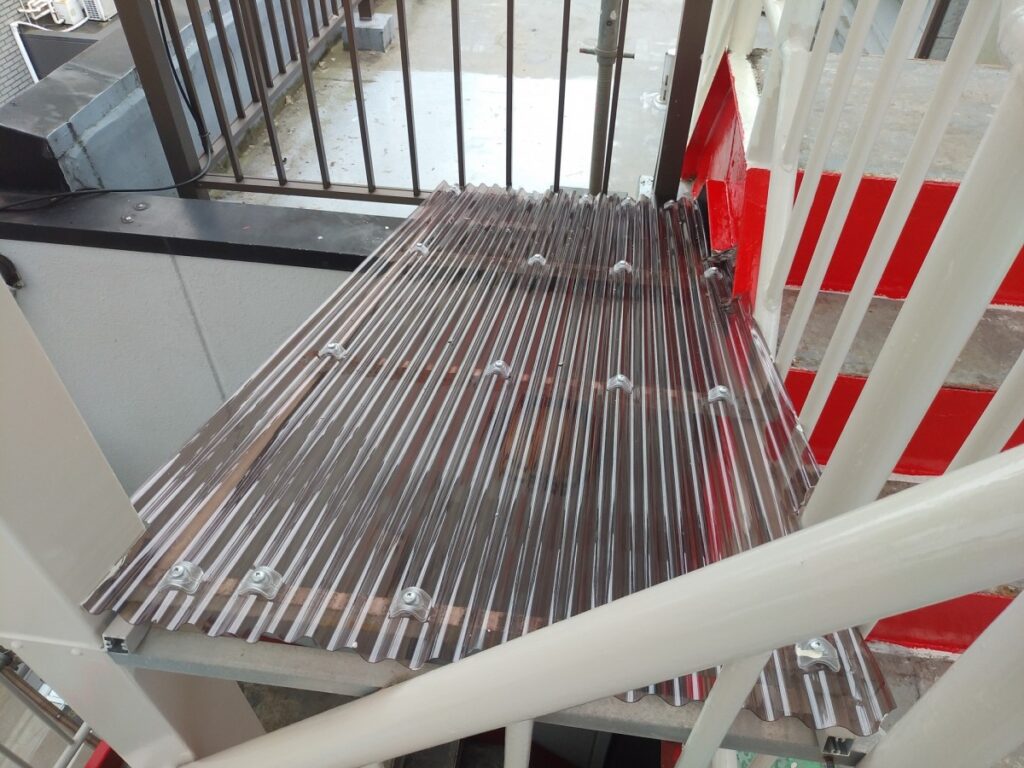 2020.09.05賃貸マンションの階段改修工事:荒川区町屋 その他の工事 この記事を書いたスタッフ 市川支店 井辺 東京都にある賃貸マンションの階段改修工事です。外壁は今のところ考えてないとのことですが、鉄階段の老朽化が激しいとの事でOB客様よりご依頼いただきました。階段の塗装と長尺シート工事を行っていきます。施工前 ~ 施工中施工前全体的に錆の進行が激しく、状態が芳しくないです。施工前段裏も水が回っていて、花が開いた状態になってしまっています。施工前R階の波板も劣化している為、塗装工事と合わせて交換致します。施工前長尺シートは端末のシーリングが硬化し、効力を発揮していない状態になっています。入隅の部分のシーリングが利いていない為、雨水が侵入しやすくなっています。施工中まずは既存の長尺シートを撤去していきます。合わせて鉄部のケレンを行います。施工中下地の部分が劣化、勾配がとれていない箇所をモルタル補修していきます。施工中ケレン完了後、サビ止め塗装を行います。色の塗り分けをご希望なので、色が乗りやすい下地材でそれぞれ仕上げていきます。施工中錆止めを塗り終わりましたら、主剤を2工程行っていきます。お客様のご希望により、レッドとクリームの塗り分けを行います。施工後塗装完了後、長尺シートを張っていき完了です。施工後R階の波板は、ブロンズのクリアーに変更しました。施工後賃貸物件という事で目立つようにしたいとお客様の希望でしたが、周りがクリーム系の色が多い為、目立つ外観になりました。インパクトのある階段なのですぐに見つけられそうですね。オリジナリティあふれる案件にするためのデザイン、集客率アップ・空室率の低下のための塗装アイディアはお気軽にご相談ください。無料診断・無料見積り 電話をかける LINEで見積り依頼 メールで見積り依頼 この記事を書いた人市川支店 井辺 このスタッフのその他の工事日記 漏水箇所補修と内装工事:八千代市萱田 傷んだサイディング補修と外壁・屋根塗装 ……