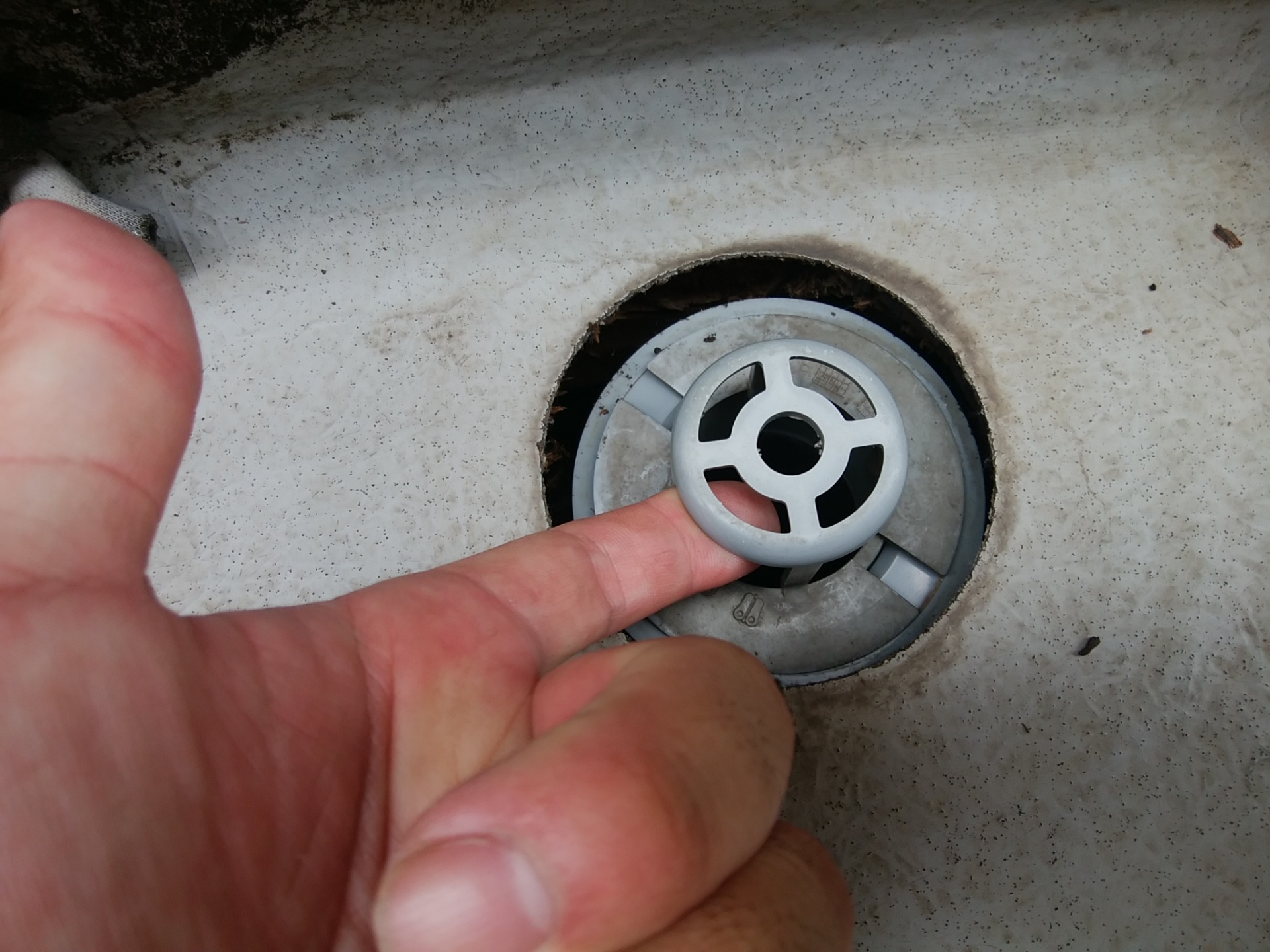 ちょっと嫌な予感がしたので、集水桝を外して下地の具合を確認してみようとしましたが、通常は回転させると外せるのですが何故かボンドでがっちり固定してあったので外れません。この時点で何か怪しさを感じます。