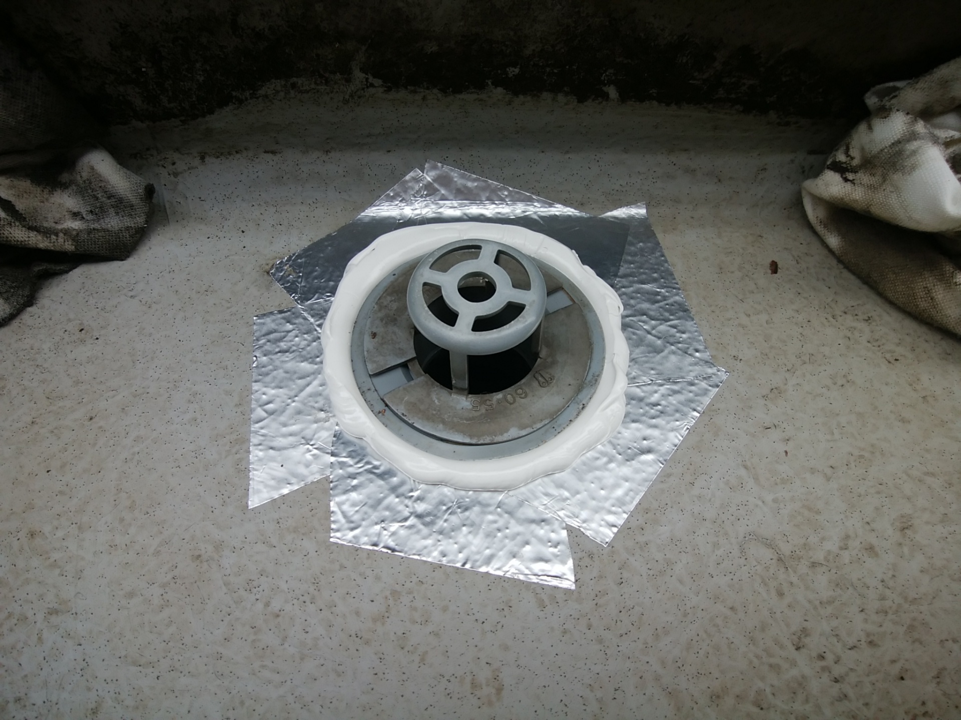 おそらく防水工事が完了後にこの辺りに水が溜まるので、ここの排水を後で取付けたものと思われます。その際、前の施工業者が開口寸法を間違えてしまい、どうにも出来なくなりコーキング等で抑え込んでまさかの工事終了にしてしまったのではないかなと。