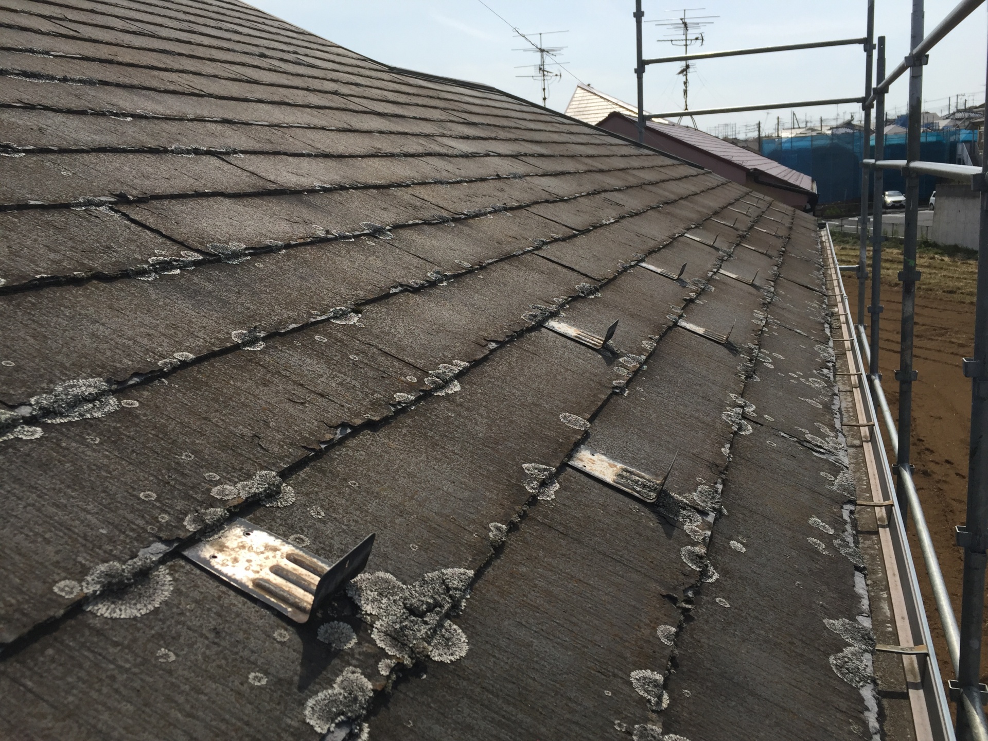 施工前の屋根です。表面の層が剥がれているのが見てとれますね。このパミール、経年劣化で何層にも分かれて剥がれてしまうんです。
