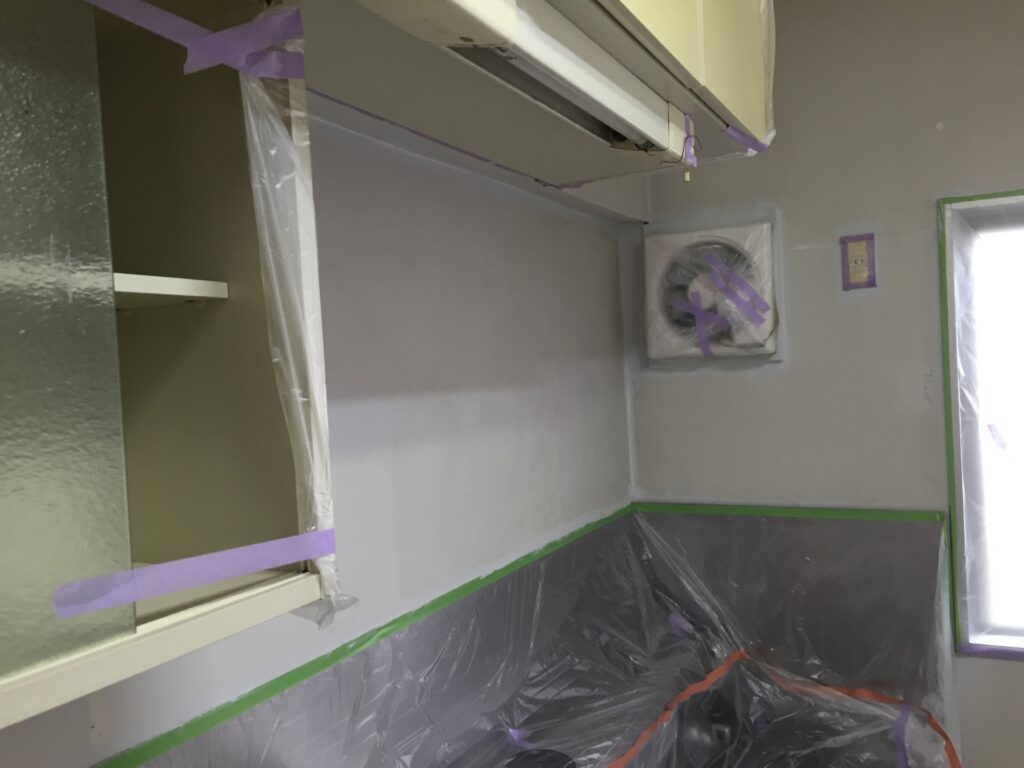 養生後の作業は、パテ処理です。室内の壁がモルタルの為、築40年超ともなると、クラック(ヒビ)がかなり入ってしまっています。このクラックを埋める為にパテ処理を施していきます。