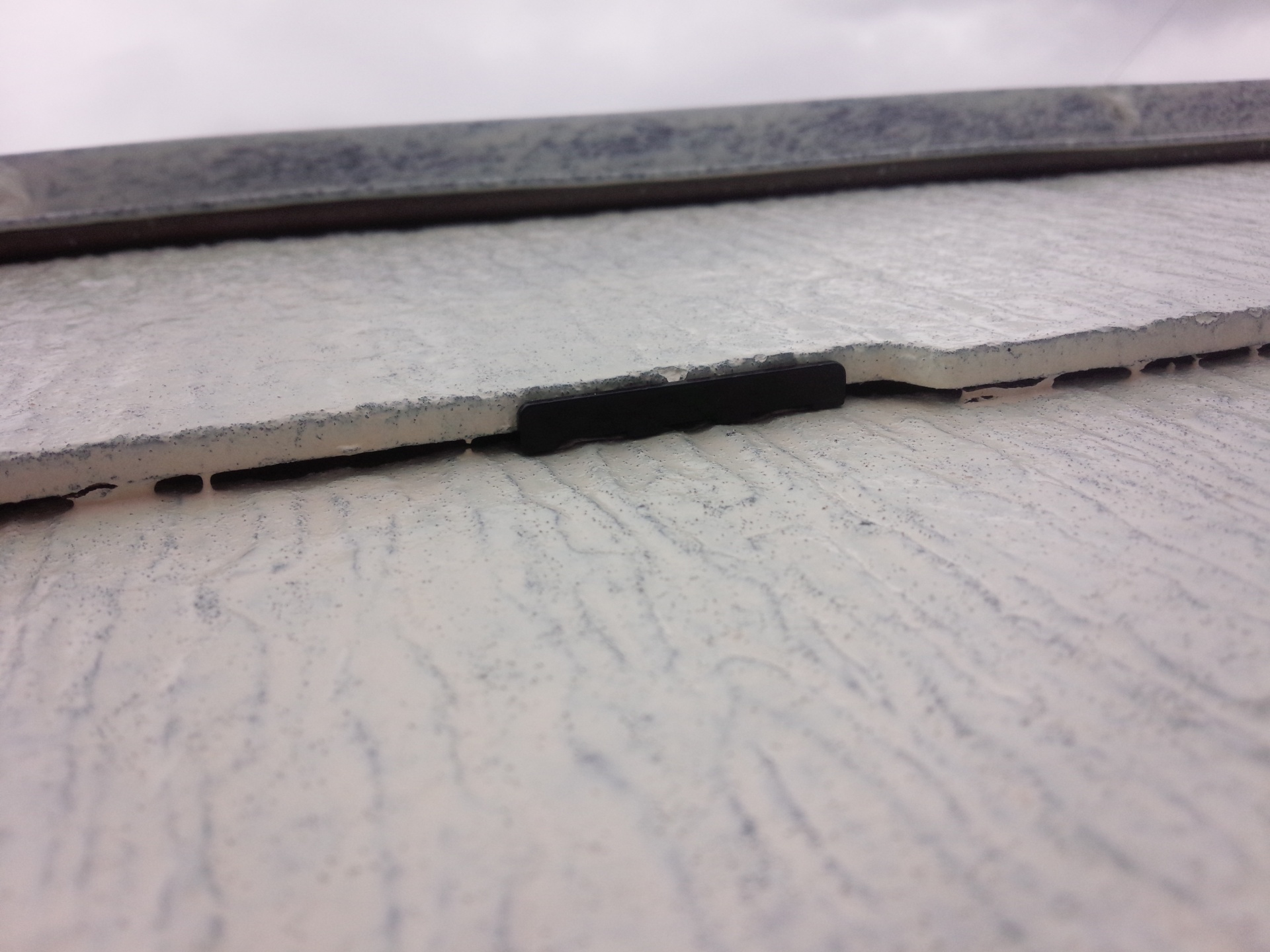 こちらがタスペーサーを入れた状態です。タスペーサーは下塗りを入れた後に挟みこみます。タスペーサーを挟んだ事によって、スレート瓦同士に1.5mmほどの隙間が開いたのが解ると思います。この上に塗装していくので、見た目も全く分からなくなります。